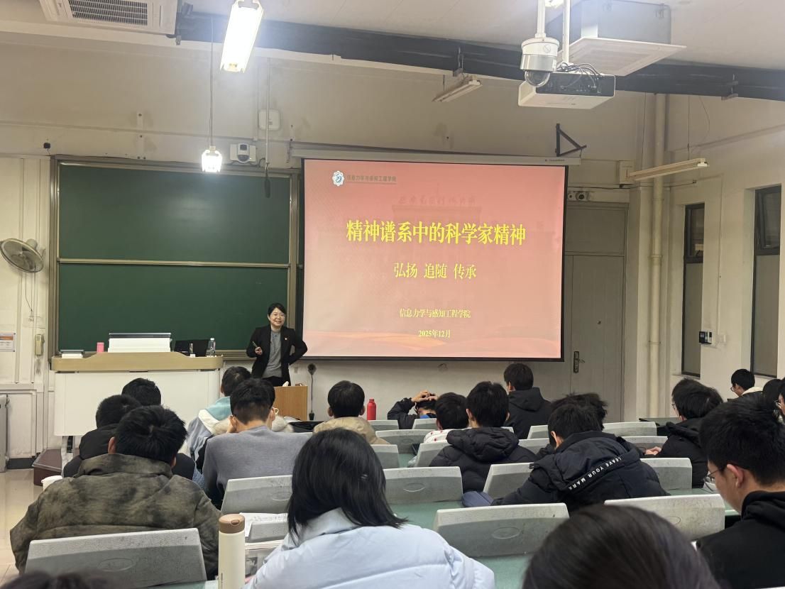 (通讯员 任心愿)为深入学习贯彻习近平新时代中国特色社会主义思想、扎实推进教育强国建设,2025年12月29日,信息力学与感知工程公司党委书记金科教授以“精神谱系中的科学家精神”为主题,为全院本科生员工讲授了一堂内涵丰富、感人至深的专题思政课。党课伊始,金科书记开宗明义,指出中国共产党人的精神谱系是一个同根同源、紧密相连的有机整体,伟大建党精神是其源头,并在各个历史时期焕发出独特的光彩。随后,她将焦点集中于科学精神谱系的重要分支—...
