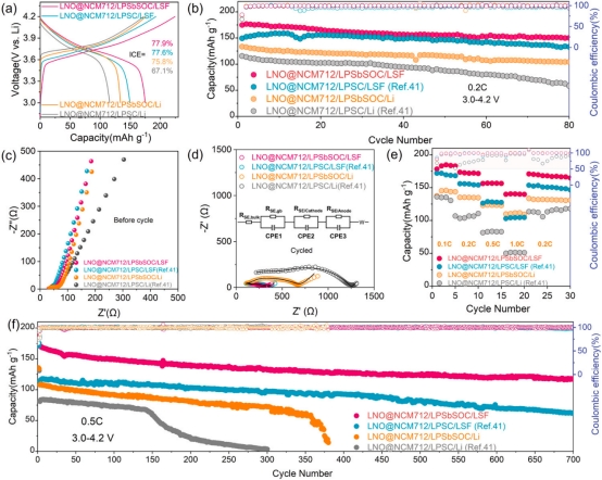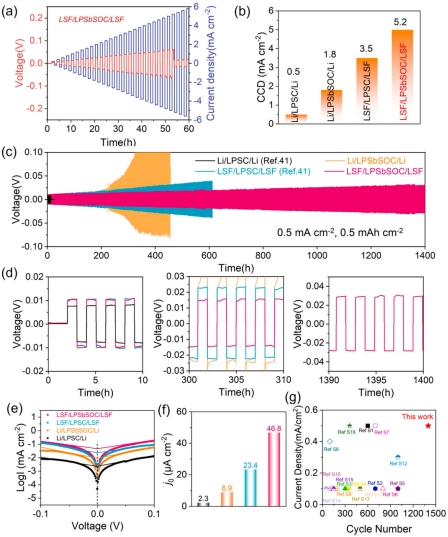 基于此,西安电子科技大学李思吾副教授与华中科技大学杨辉教授、余创教授合作,创新性地提出“复合阳极+功能电解质”的双重保护策略,构建了具有高锂亲和力与高界面能的Janus界面。一方面,作者通过熔融锂金属与SnF₂反应,形成由Li、Li₂₂Sn₅合金和LiF组成的复合结构。其中,Li₂₂Sn₅合金构建快速电子/离子传导网络,优化锂离子体相扩散;LiF凭借高界面能延缓锂枝晶生长,起到“疏通”锂离子分布的作用。另一方面,作者在Li₅.₅PS₄.₅Cl₁.₅硫化物电解质中引入Sb和O元素,使其与锂金属接触时原位生成Li-Sb合金界面。该界面不仅加速锂离子迁移,还能在高电流密度下主动消耗穿透的锂枝晶,形成稳定阻挡层,发挥“阻断”功能。实验结果显示,采用双重修饰策略的对称电池在0.5 mA/cm²下稳定循环1400小时,过电位仅从10 mV缓慢增至29 mV;临界电流密度(CCD)高达5.2 mA/cm²,远超单一修饰策略(1.8-3.5 mA/cm²)。全电池测试中,基于LiNi₀.₇Co₀.₁Mn₀.₂O₂正极的ASSLMB在0.5C倍率下循环700次后容量保持率达70%,且在-20°C至60°C宽温域内表现优异,高温(60°C)循环150次容量保持90%,低温(-20°C)循环90次仍保有80%容量。