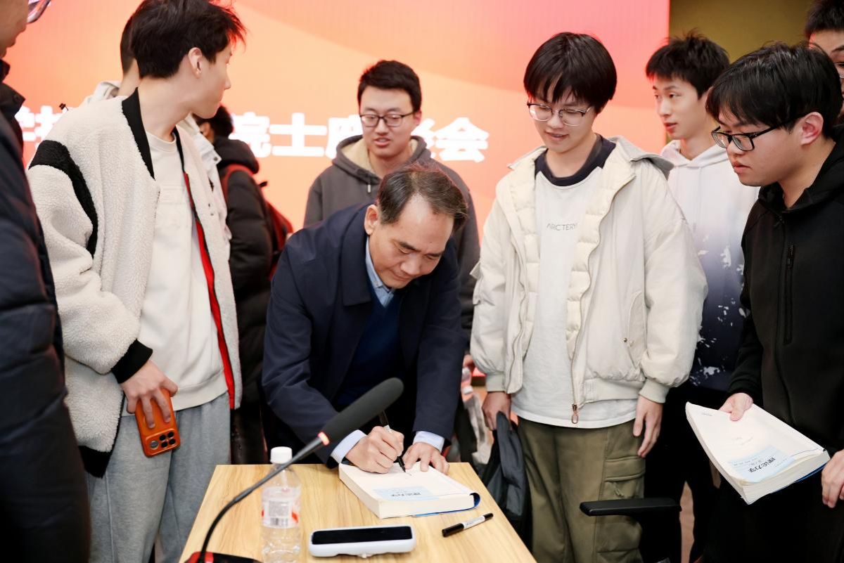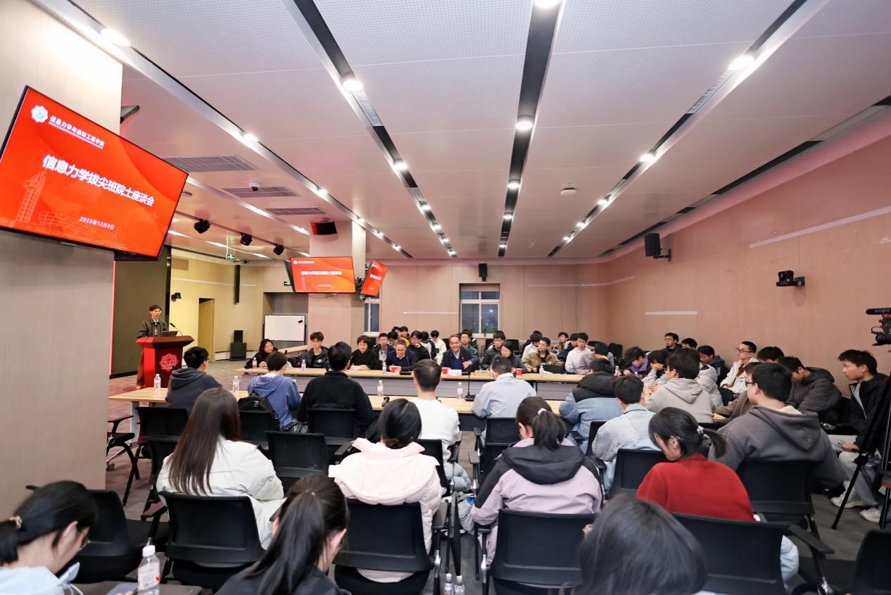 报告会后,周院士出席信息力学拔尖班座谈会。座谈会由2025级团支书俱一涵同学主持,现场气氛热烈。2024级团支书李雨璐首先汇报了拔尖班在班级建设、课程学习、科创竞赛、社会实践以及科研训练等方面取得的成绩,特别介绍了班级在交叉学科学习方面的实践探索。